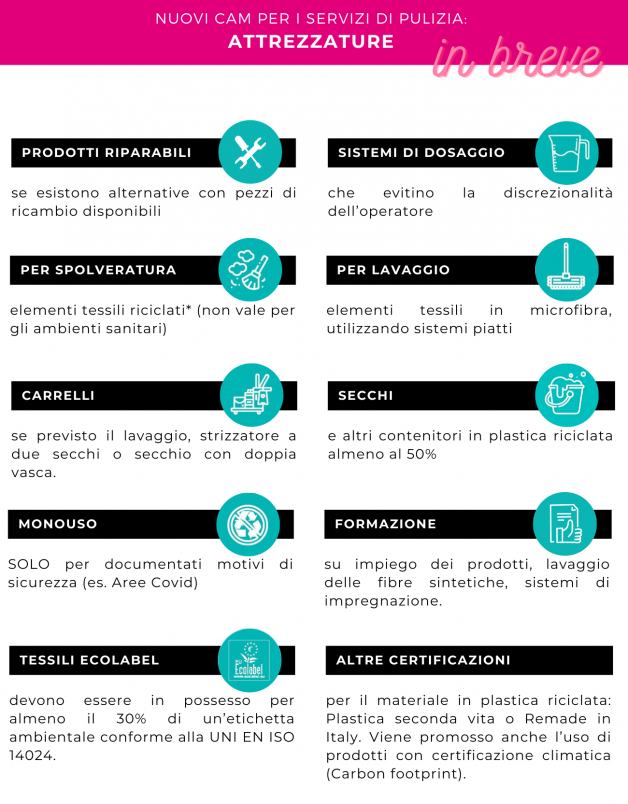Dopo aver visto assieme cosa cambia in linea generale e per i prodotti chimici nello specifico, oggi approfondiremo i nuovi CAM per i prodotti ausiliari per l'igiene. Quali sono le novità per il mondo delle attrezzature?