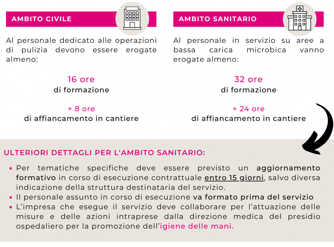 Per quanto riguarda le ore minime di formazione necessarie, esiste una consistente differenza tra attività svolte in ambienti ad uso civile e personale addetto al servizio invece in ambito sanitario: