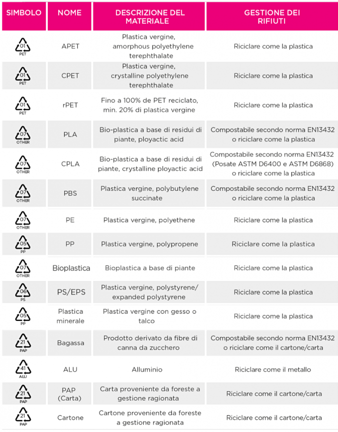 NB: piatti e bicchieri di plastica sono riciclabili per legge perché considerati imballaggi e vengono gettati nella differenziata della plastica.