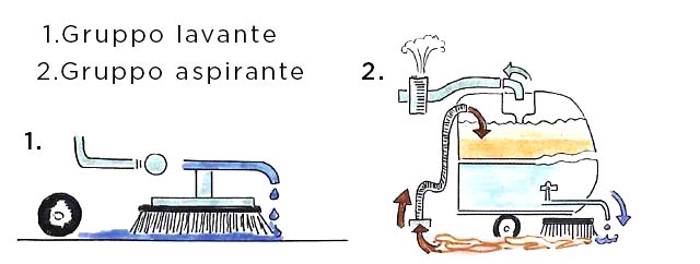 • un gruppo aspirante, che invece raccoglie da terra la soluzione sporca e la immette in un serbatoio di recupero.