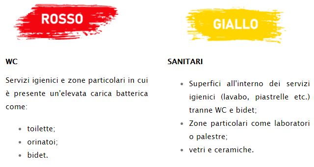 Questa suddivisione serve a diversificare correttamente i detergenti e le attrezzature (panni, secchi, mop, frange...) da utilizzare nelle varie fasi di lavoro, colorati secondo la tabella codificata. In questo modo è possibile evitare il rischio di contagio tra un ambiente ed un altro, ottimizzando al contempo la produttività del servizio di pulizia.