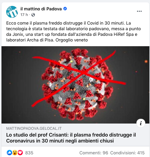 Il Dipartimento di Medicina Molecolare, diretto dal Prof. Andrea Crisanti, ha sottoposto la tecnologia Non Thermal Plasma presente nei dispositivi Jonix a test di laboratorio per verificarne l’attività virucida specifica su SARS CoV-2.